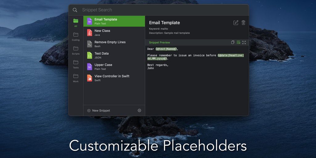 Snippety is a tool that can boost your everyday tasks. It works flawlessly with every text field! Just press ⌘⇧Space, find your snippet, and hit ↩︎. Snippety also offers many placeholders and you can