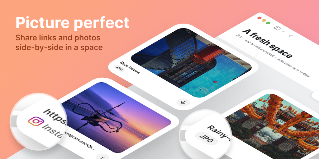 We're rethinking sharing. Each visit to new.space creates an entirely new, blank space for your files, photos, links, and more. No account or setup needed. Everything shared into a space is end-to-end