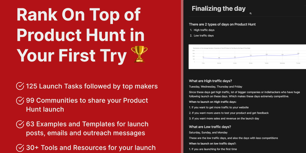 Rank on top of Product Hunt in your first try with the Product Hunt Workbook! ⌛ 125 Launch Tasks followed by top makers in 2023. 🫂 99 Communities to share your PH launch. ✍️ 63 Done For You Content te