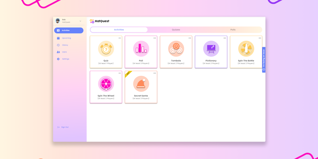 Revolutionize your team-building experience with HatQuest. Connect with your team no matter where you are, and create unforgettable bonds over interactive activities like multiplayer Quizzes, Pictiona