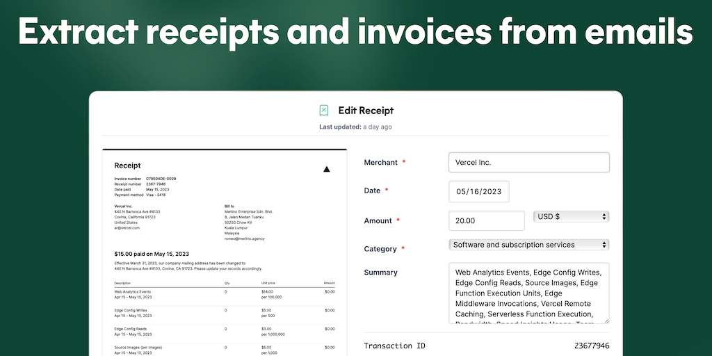An AI-powered tool that automates receipt extraction from Gmail/Outlook, analyses past emails, and provides detailed receipt info. It integrates with your expense management system and simplifies tax