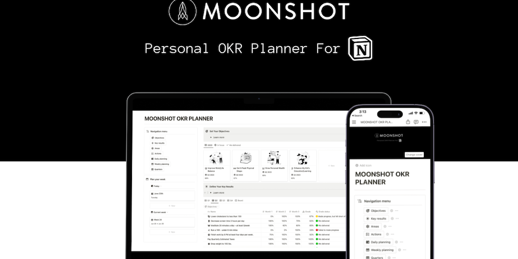 Experience a productivity leap with the Moonshot OKR Planner for Notion. Harnessing the OKR goal-setting framework, it blends the Moonshot Hardcover Planner's simplicity with the robust features of No