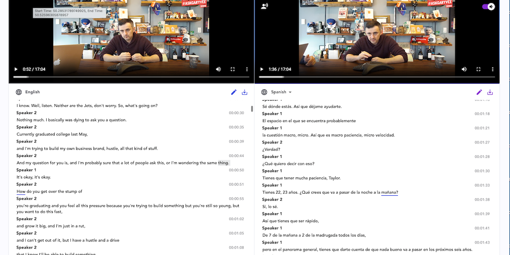 Users upload an audio or video file and the service generates an editable transcript, translation and dub using the same voices as the original speakers. Download captions, subtitles and dubbed audio