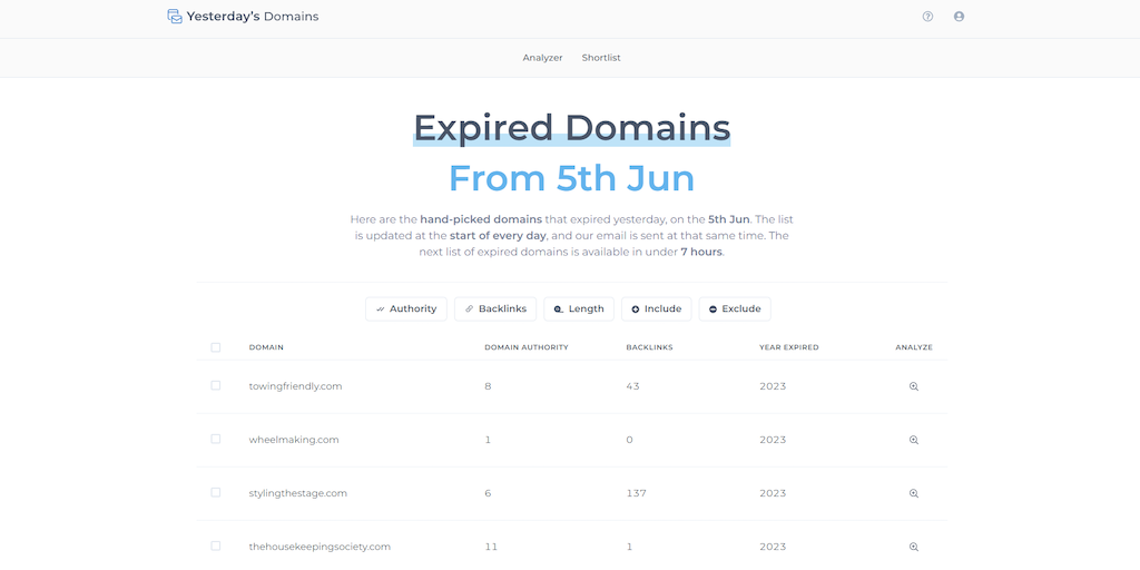 Everyday we send out new list with 100s of hand-chosen domains that had expired the previous day, both through email and your personal dashboard. Plus, there is also an analysis tool that provides aut