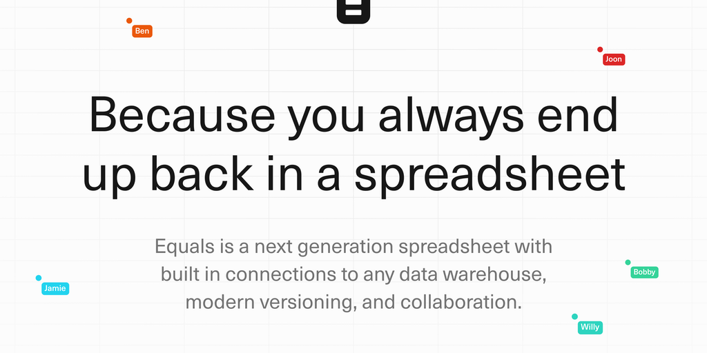 Equals is a next generation spreadsheet with built in connections to any data warehouse, modern versioning, and collaboration. For founders and startup operators, Equals is the simplest and fastest wa