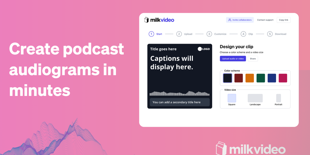 This is a tool to quickly turn podcasts into social audiograms. There is no sign up and it's free! How it works: * Upload a podcast * Add titles and set colors * Clip a key moment * Download and share