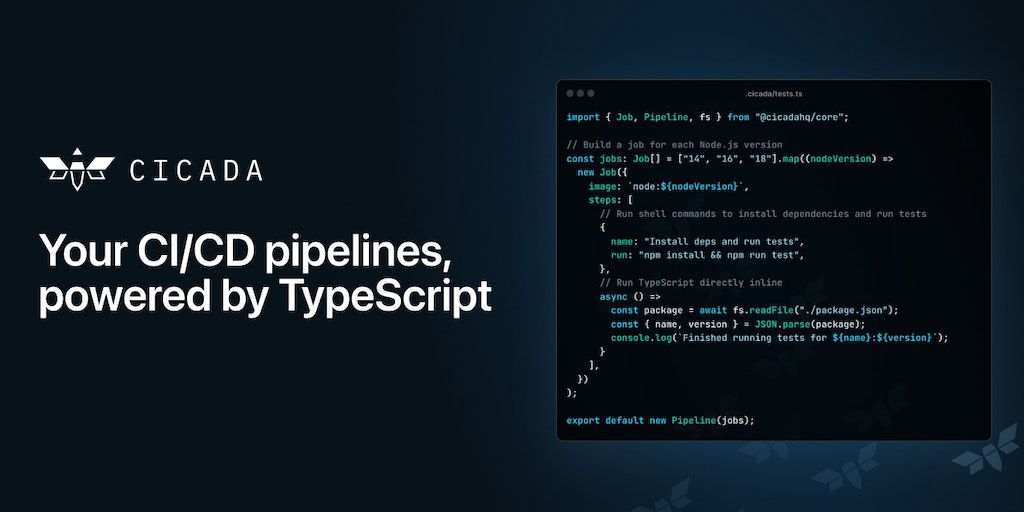 Cicada is a modern CI/CD engine that lets you write your pipelines using TypeScript, rather than YAML. With Cicada, you can test jobs locally on your machine and run them in the cloud.