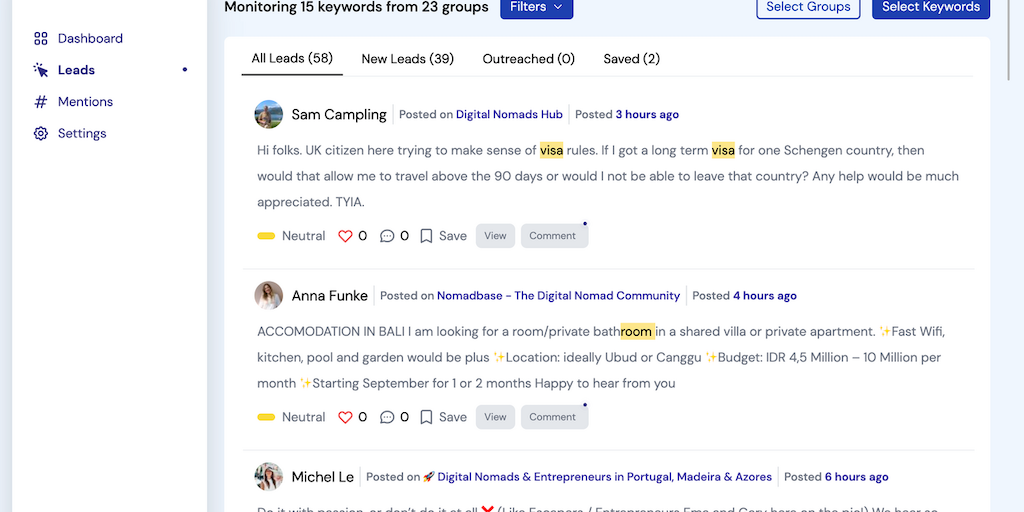 Devi monitors your Facebook groups and LinkedIn to find organic high-intent leads automatically. You can also DM or comment using the tool. FYI: 80% of all purchases are a result of word of mouth & re