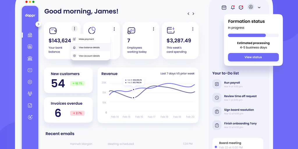Dappr is an all-in-one platform for starting and running a business. We take you all the way from forming a legal entity to generating revenue. Features: Banking, accounting, payroll, HR, digital mark