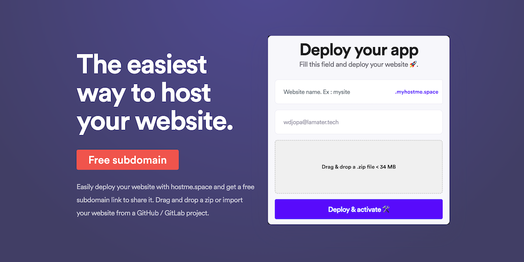 Hostme is a hosting platform designed for developers. It makes it easy to deploy static and PHP websites, from a Zip or directly from your GitLab or GitHub repository. With Hostme, you can focus on de