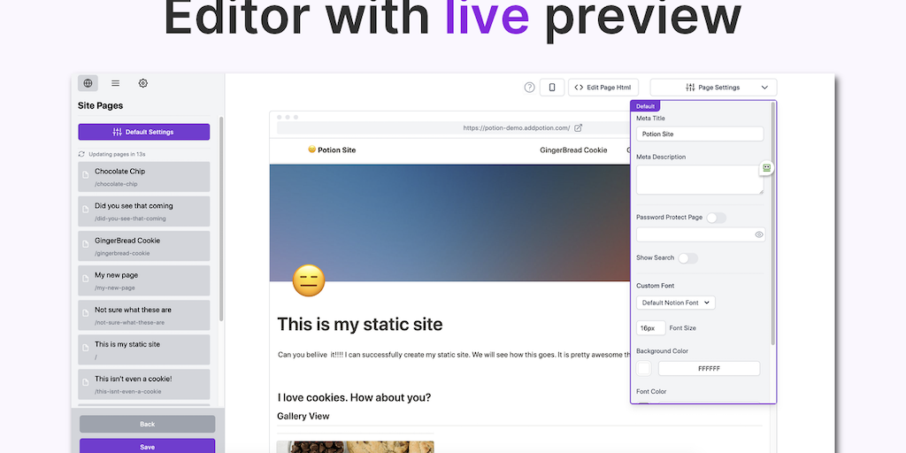 Potion allows you to create custom Notion websites and v2 is even better! All new dashboard editing experience with live preview, password protected pages, settings per page, more SEO settings and a n