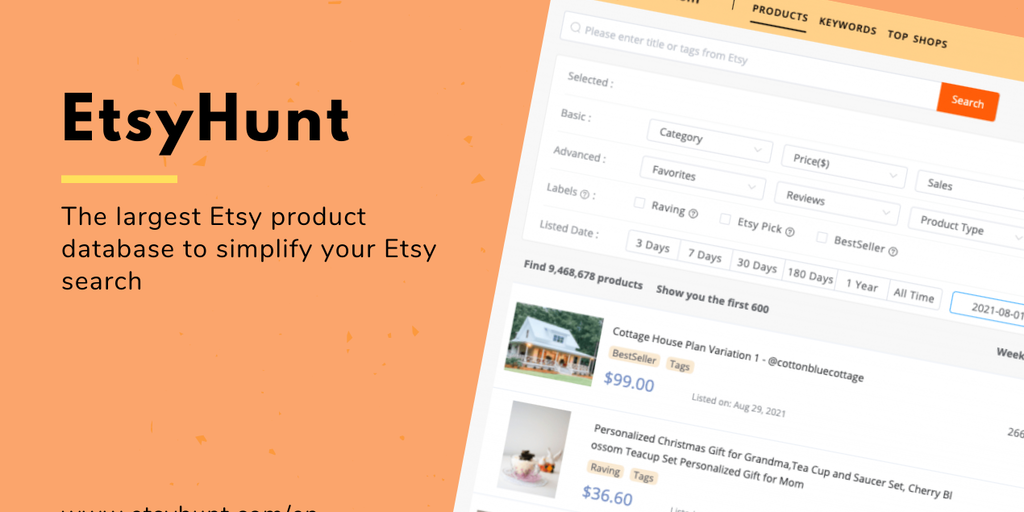 Improve your Etsy shop rank and visibility. Backed by data from 27,000,000 product listings, EtsyHunt makes it easy to research and optimize your Etsy SEO, product listings and tags.