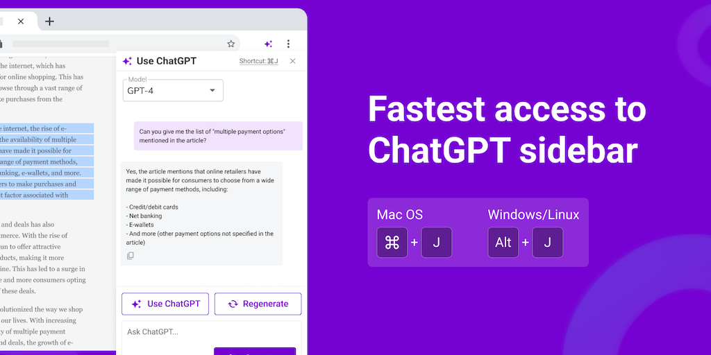 Free Chrome extension offering you the fastest way to access to ChatGPT and GPT-4. With "Use ChatGPT", you can write, rephrase, summarize, translate, or explain any text on any website without copy-pa