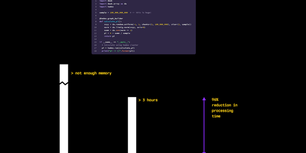 Hades provides you with a serverless Python+Dask environment that scales across hundreds of workers to reduce development time & cost by orders of magnitude. Simple, supercomputer scale processing in
