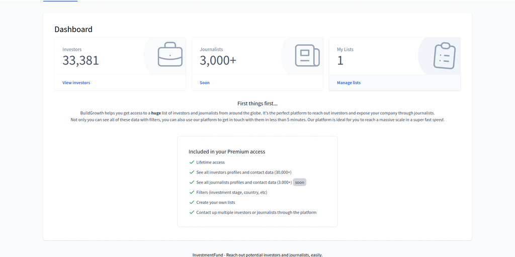 BuildGrowth helps companies to find and organize investors in an easy way. With more than 30.000 filterable investors, users can create unlimited lists and contact multiple investors at once through t