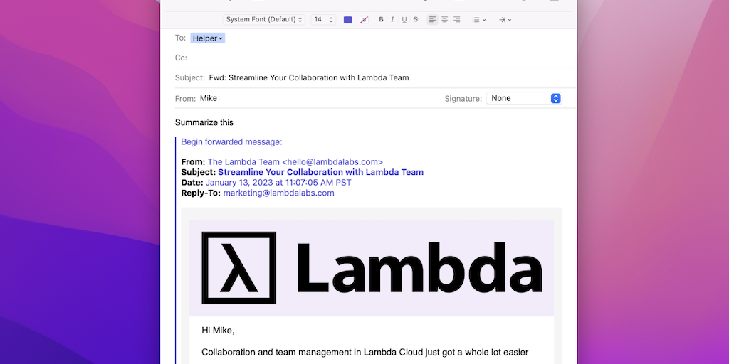 Get GPT to write your emails, summarize long threads, and more — from any email client. Just send your OpenAI API key to ask@helper.email to get started.