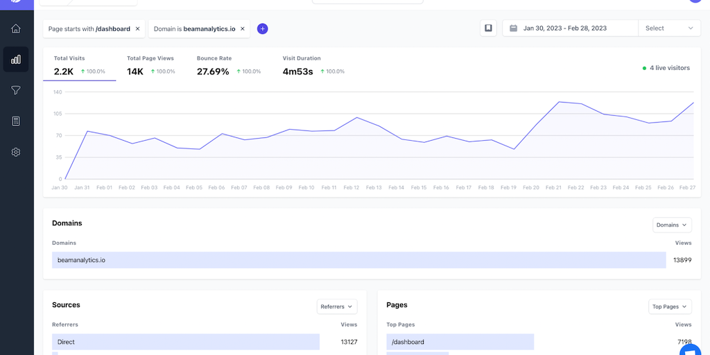 Beam Analytics is the best GA4 alternative with the most generous free tier (up to 100k pageviews a month). It is GDPR compliant and cookie-free, and comes with funnel analysis, custom events and coho