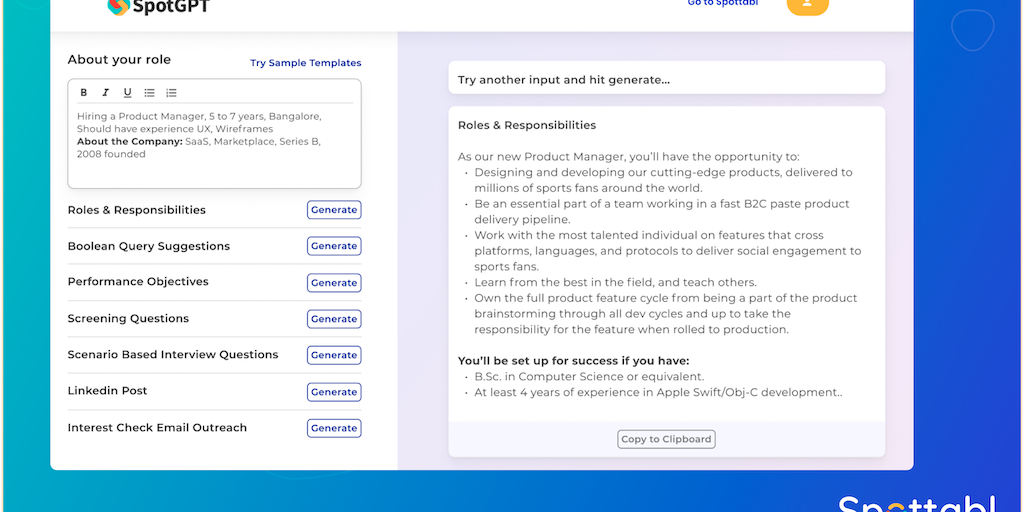 SpotGPT: Revolutionizing recruiting and interviewing with AI. Effortlessly craft job descriptions, screen candidates, generate interview questions, and more. Your all-in-one solution for recruiters an