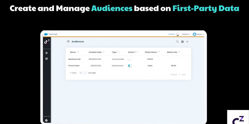 Cezium AdZ for Salesforce Marketing Cloud allows to use Tiktok Ads as a marketing channel: - connect your Tiktok Ad Account - push segments to Tiktok Ads - use Tiktok Ad Audiences in Journey Builder -
