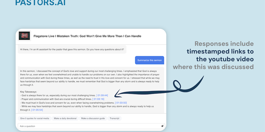 Custom chatbots based on church sermons. Just input a youtube video of a church service, and get a chatbot that generates sermon summaries, discussion guides, and quotes for social media.