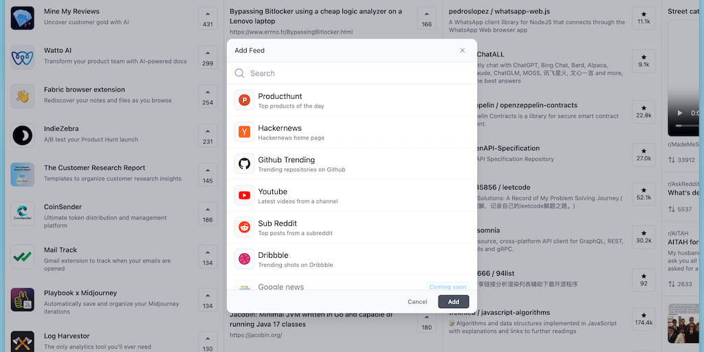 Feedful is a tweetdeck styled news reader. You can add columns for respective publications. Feedful currently supports Producthunt, Hackernews, Github trending, Reddit, Youtube, Dribbble. RSS, Google