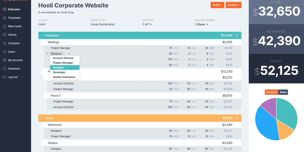 Increase team collaboration and make your project estimates more accurate than error-prone spreadsheets. Pre-defined roles and rate cards allow you to quickly create estimates and share them with your