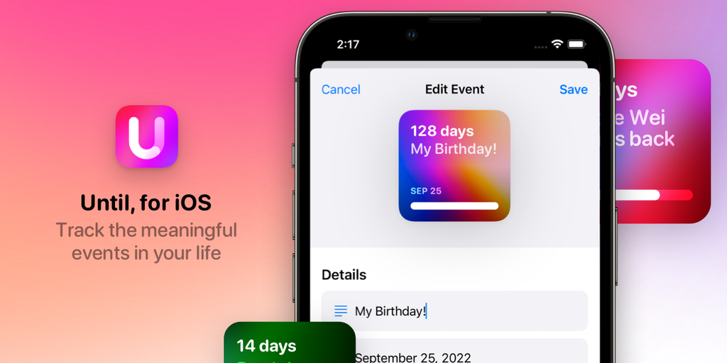 Until lets you create beautiful widgets to count down the days until meaningful events in your life. Works on iPhone, Apple Watch and Mac.