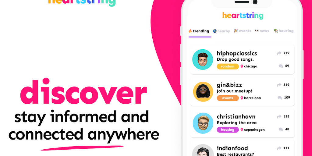 Heartstring is a fresh take on social messaging. Discover what people want to talk about around you or worldwide. Easily stay connected, engaged and informed with your communities and the world.