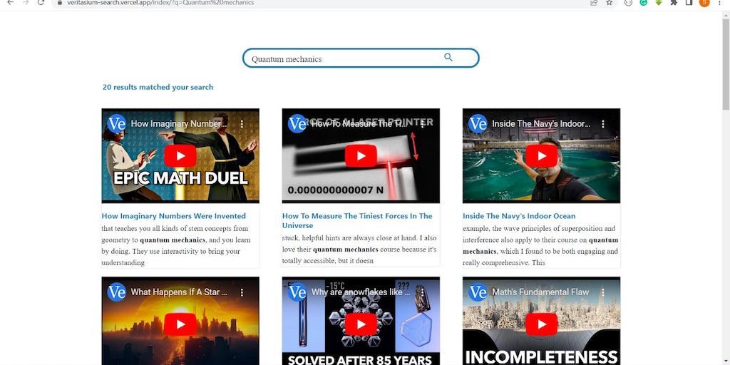 Archive is a YouTube Channel Search Engine. The search query is synced with the timestamp, so the video starts from the search word itself. We only support Veritasium Youtube Channel as of now. Which