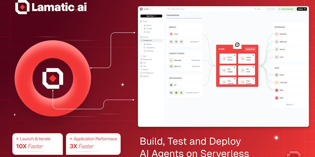Lamatic is the AI middleware to build Agents visually, Deploy on Serverless, and let your team Optimize continuously while we handle the rest. Lamatic Provides - 🚀 No-Code Agent Builder with RBAC and