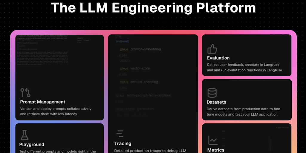 Langfuse is the #1 open source LLM engineering platform. It helps teams iterate on and improve their LLM applications: LLM tracing, metrics, llm-as-a-judge, evaluations, prompt management, datasets te