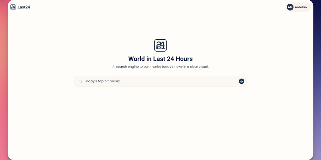 Last24 is an AI search engine that helps you understand today's news fast. It searches the internet, picks the important news you need, and summarizes the key points in a beautiful mindmap. Last24 mak