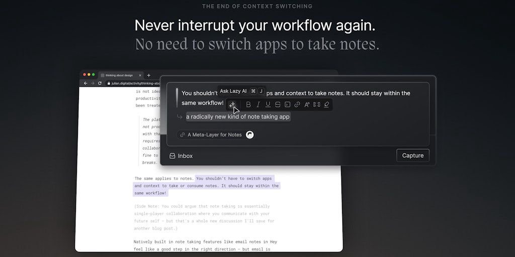 Context switching is poison for productivity. When you get that brilliant idea or see something inspiring, you should be able to take smart notes without switching app or tabs. That’s Lazy. One ⌘ sh