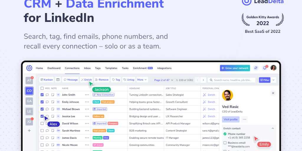 Unlock contact data, organize your network, and collaborate with your team. LeadDelta is a LinkedIn CRM that helps you find business & personal emails, phone numbers, and manage your relationships lik