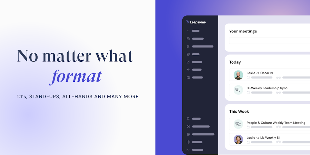 Stop wasting time with unproductive meetings! Take control of your 1:1s, stand-ups and all-hands with Leapsome Meetings. Collaborate on agendas, assign action items and keep teams on track. Free for e