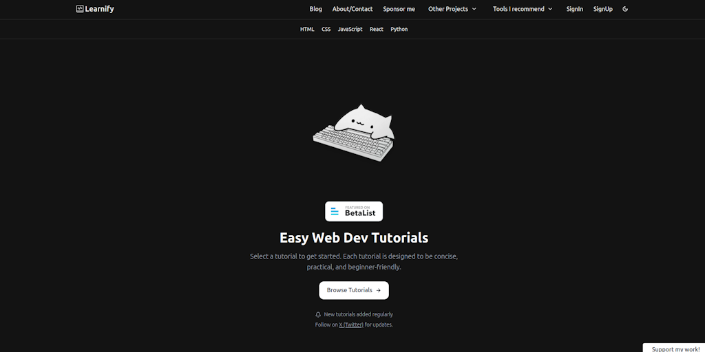 Learnify is a beginner-friendly web dev platform that makes learning clean and structured. Master HTML, CSS, JavaScript, React & Python through clear explanations, real-world examples & zero-fluff gui