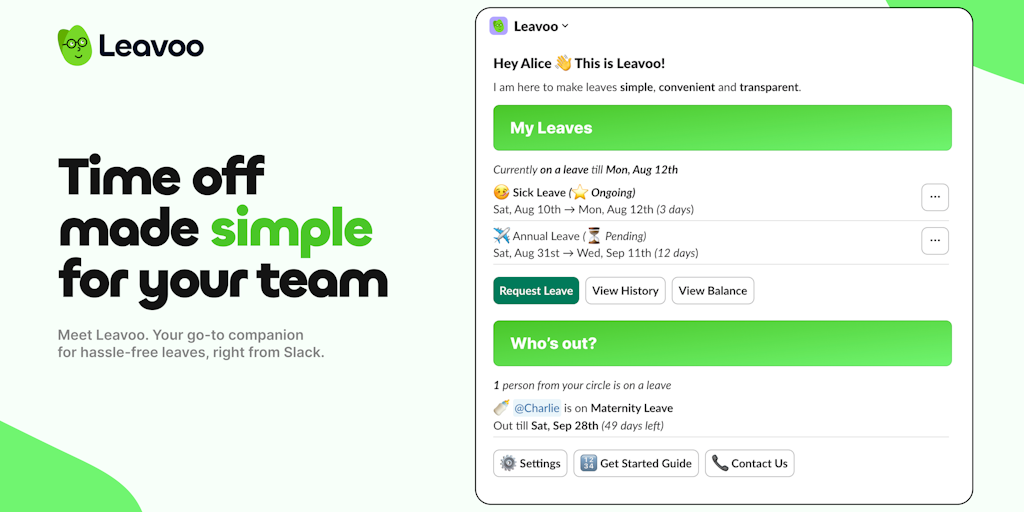 Meet Leavoo. Your go-to companion for hassle-free leaves, right from Slack. Request, approve, and track leaves in seconds. Built for managers, HR, and fast-moving teams.