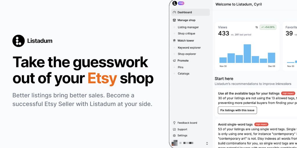 Listadum is a shop manager that uses data & AI to improve your sales & revenue for your Etsy shop. Analyze your listings, and get suggestions on how to improve them.
