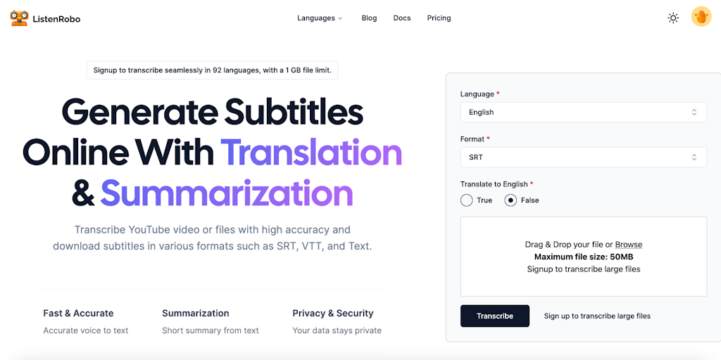 ListenRobo is an AI-powered transcription platform that accurately transcribes, summarizes, and translates media files (audio & video) into text or subtitles for content creators. Sign up now to start