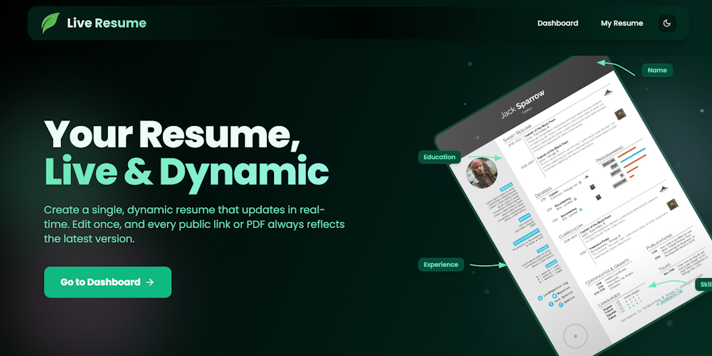Live Resume makes PDFs and resume links that never go outdated. Every PDF contains a hidden meta data & pixel that pulls your newest data whenever it's scanned, and your public resume URL always stays