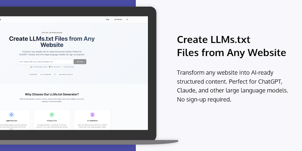 Create LLMs.txt files for free. Transform any website into AI-ready structured content. No API keys or signup required. Perfect for ChatGPT, Claude, and other large language models. Fast, reliable, an