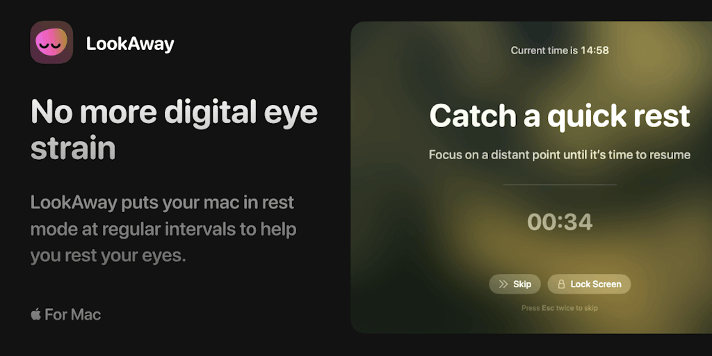 LookAway is a native macOS app which puts your mac in rest mode at regular intervals to help you rest your eyes. It helps in reducing digital eye strain and dry eyes due to prolonged screen use. It's