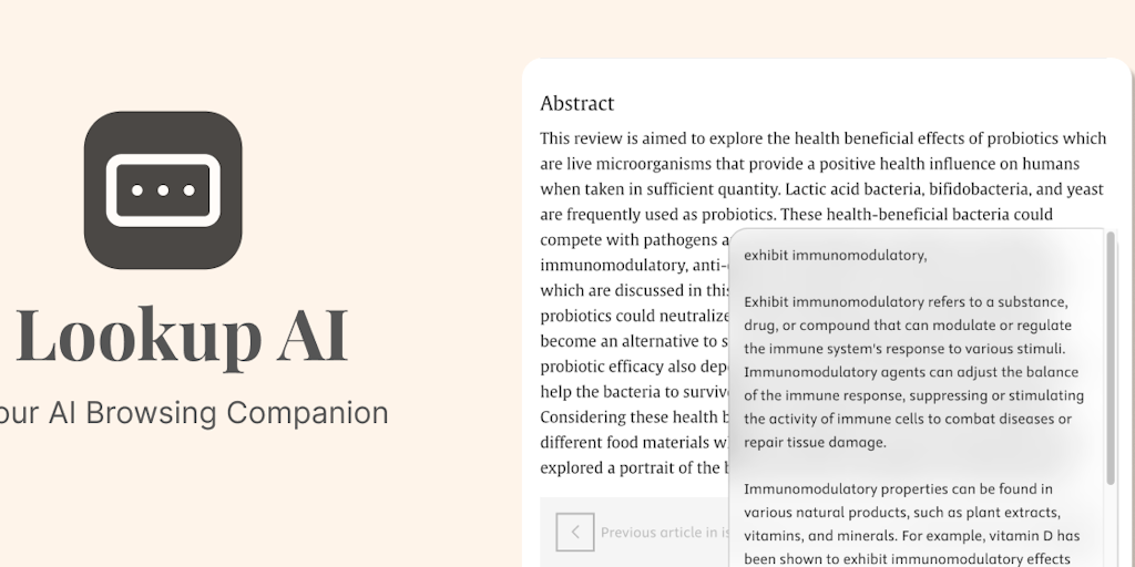 Just highlight and click - Lookup AI is an AI Chrome Extension that allows you to highlight text on the webpage and click a button to instantly lookup AI-generated definitions. It sits quietly at the
