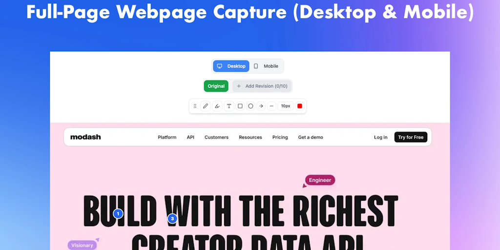 Loomoz is a modern visual feedback tool that helps teams work faster and communicate clearly. Capture full-page webpages on desktop and mobile, add threaded annotations with arrows, highlights, shapes
