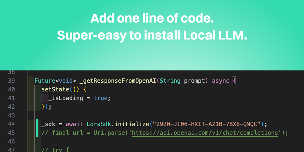 Lora is a local LLM designed for Flutter. It delivers GPT-4o-mini-level performance and is built for seamless integration—call it with just one line of code.