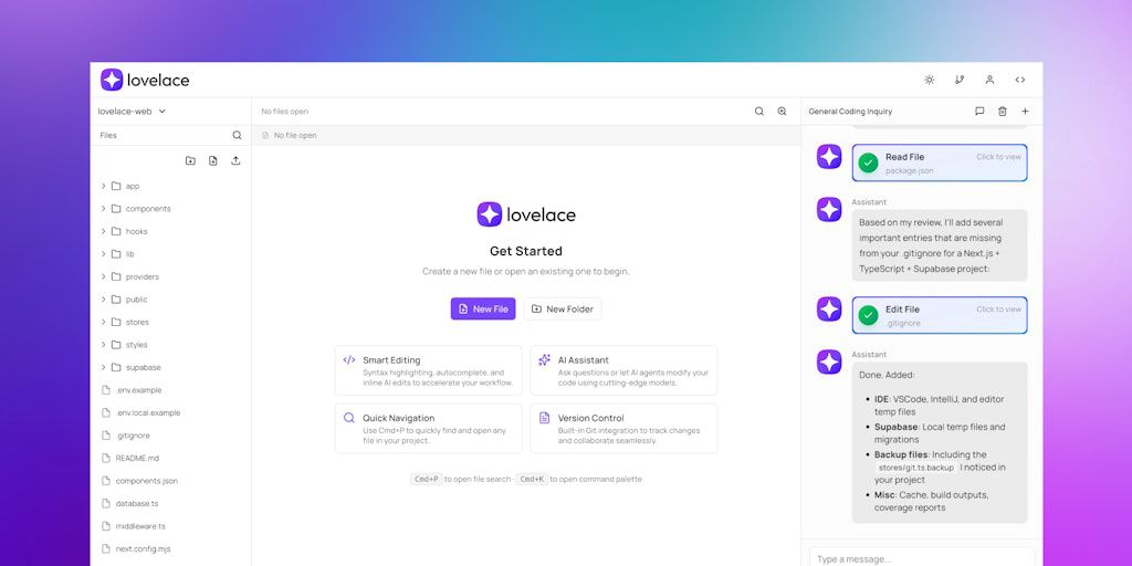 Lovelace is a browser-based AI IDE for developers who code from anywhere. It delivers AI-powered code completion, generation, and an integrated AI Agent across any device. The tool provides cloud-base