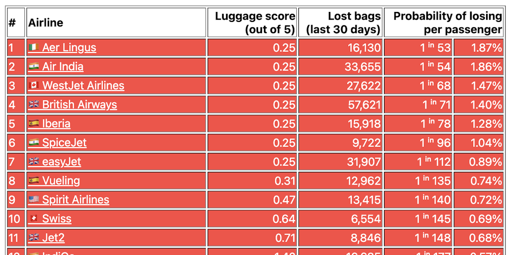 Luggage Losers - Live ranking of airlines by how much luggage they are losing | Product Hunt