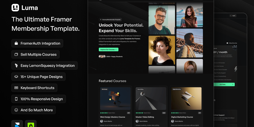 Luma is the First ever Framer Template that allows you to Sell multiple Courses and your Membership Content with ease right inside Framer - Powered by FramerAuth.