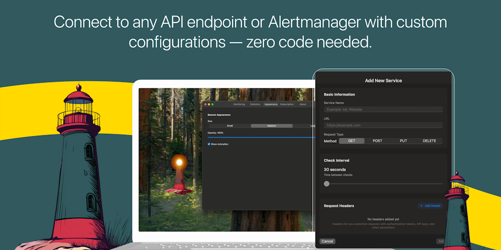 Lumenator Pro - monitoring that doesn't interrupt. Native macOS app using peripheral vision instead of alerts. Built with SwiftUI. Respects your focus. A glowing lighthouse = healthy services. You'll