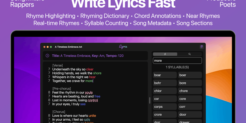 The only lyric writing app that highlights rhymes, counts syllables, accepts near rhymes, shows chords, organises sections and so much more.